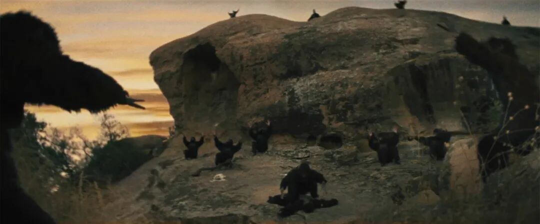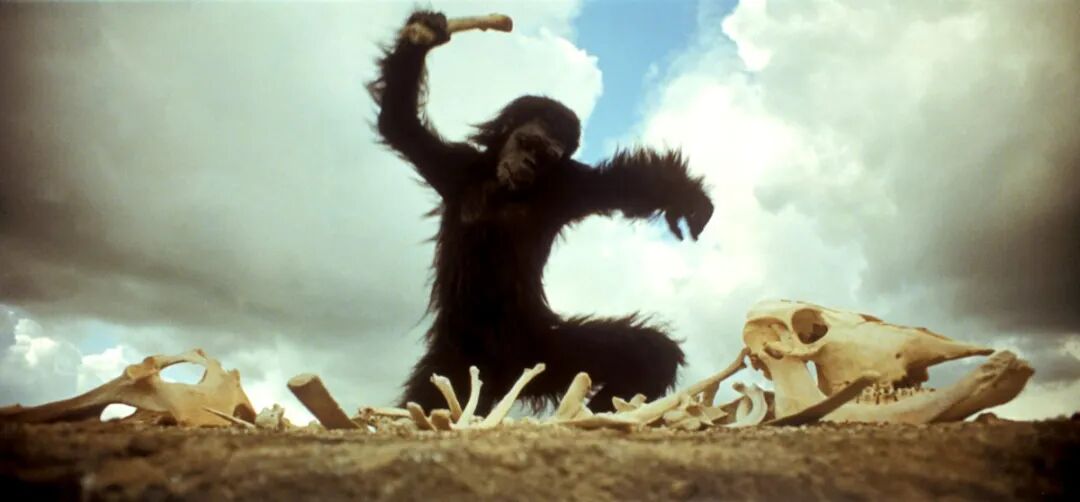 中,一只黑猩猩正挥舞热狗手指击打被压在身下的同伴,这一画面,显然是在借用《2001太空漫游》中古猿以骨击尸的场景,代表“一种进化”。