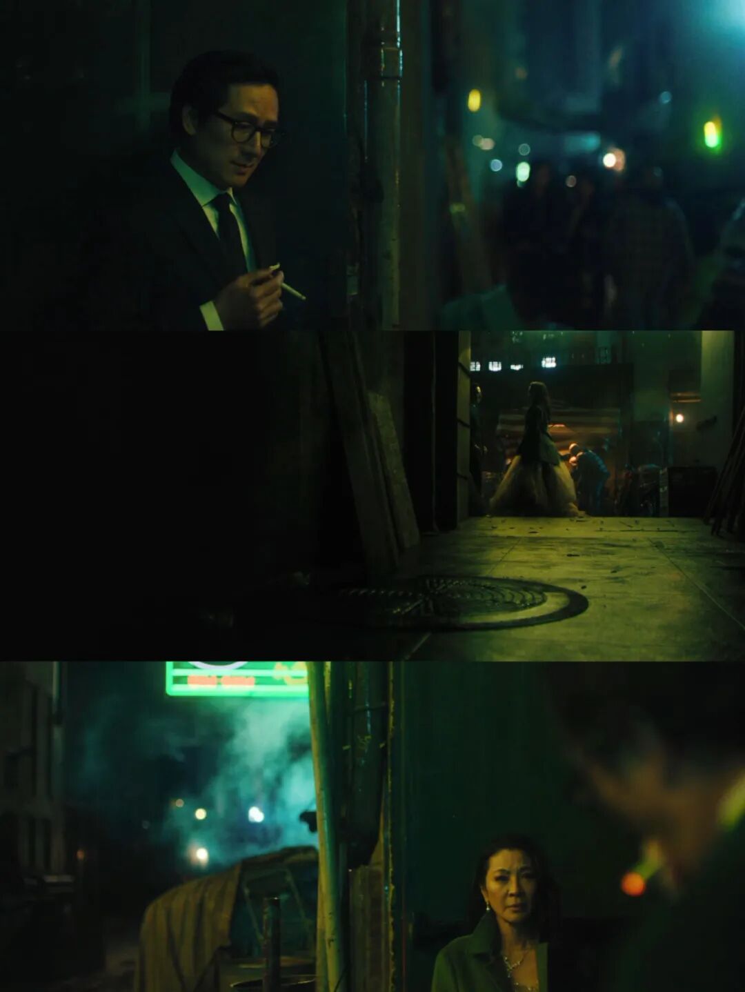 中,巨星伊芙琳和名流韦蒙在湿漉、暧昧的雨巷深夜中,上演一出追昔抚今、互诉衷肠的戏码,则做足了王家卫《花样年华》的怅然美学。